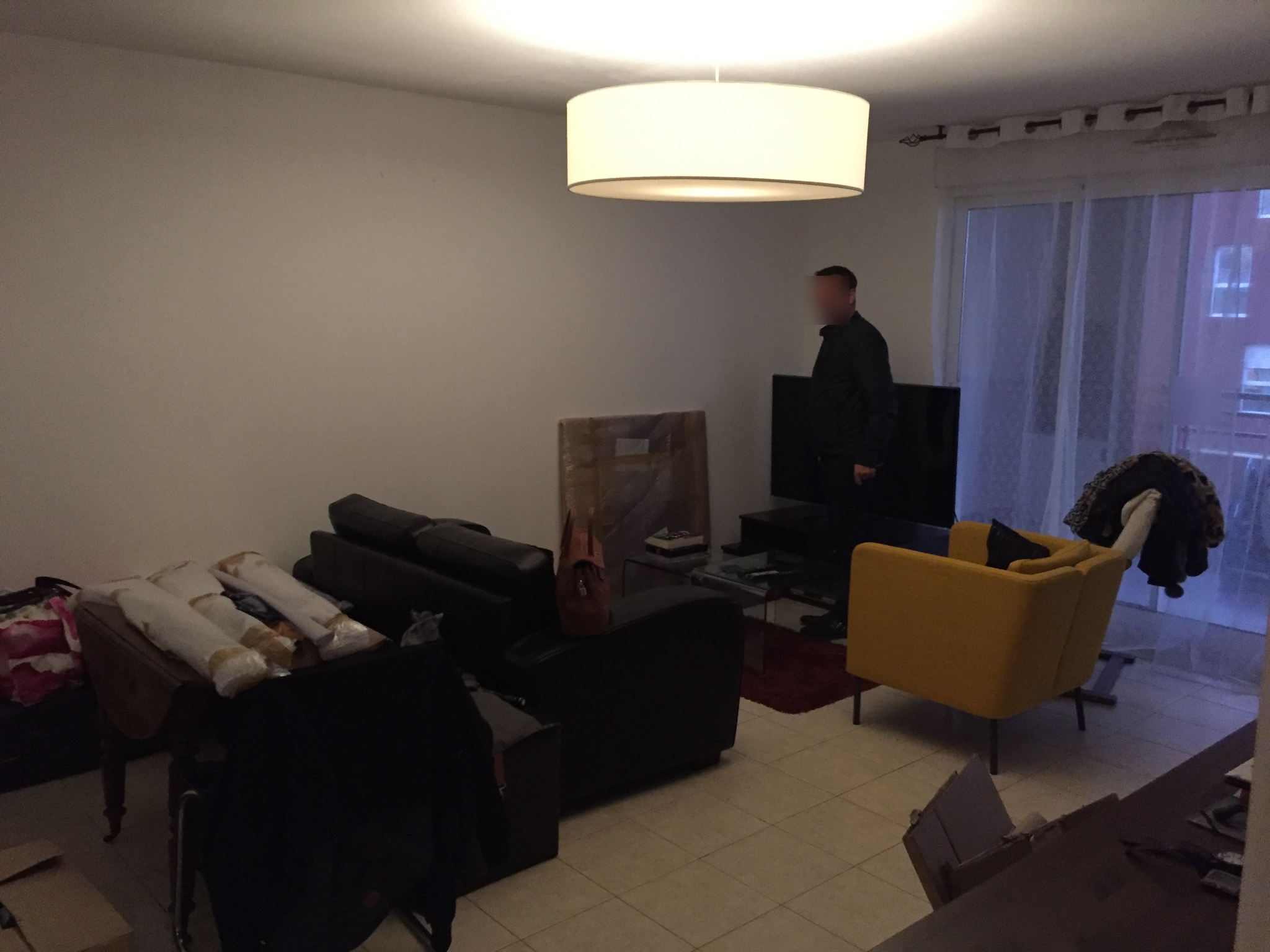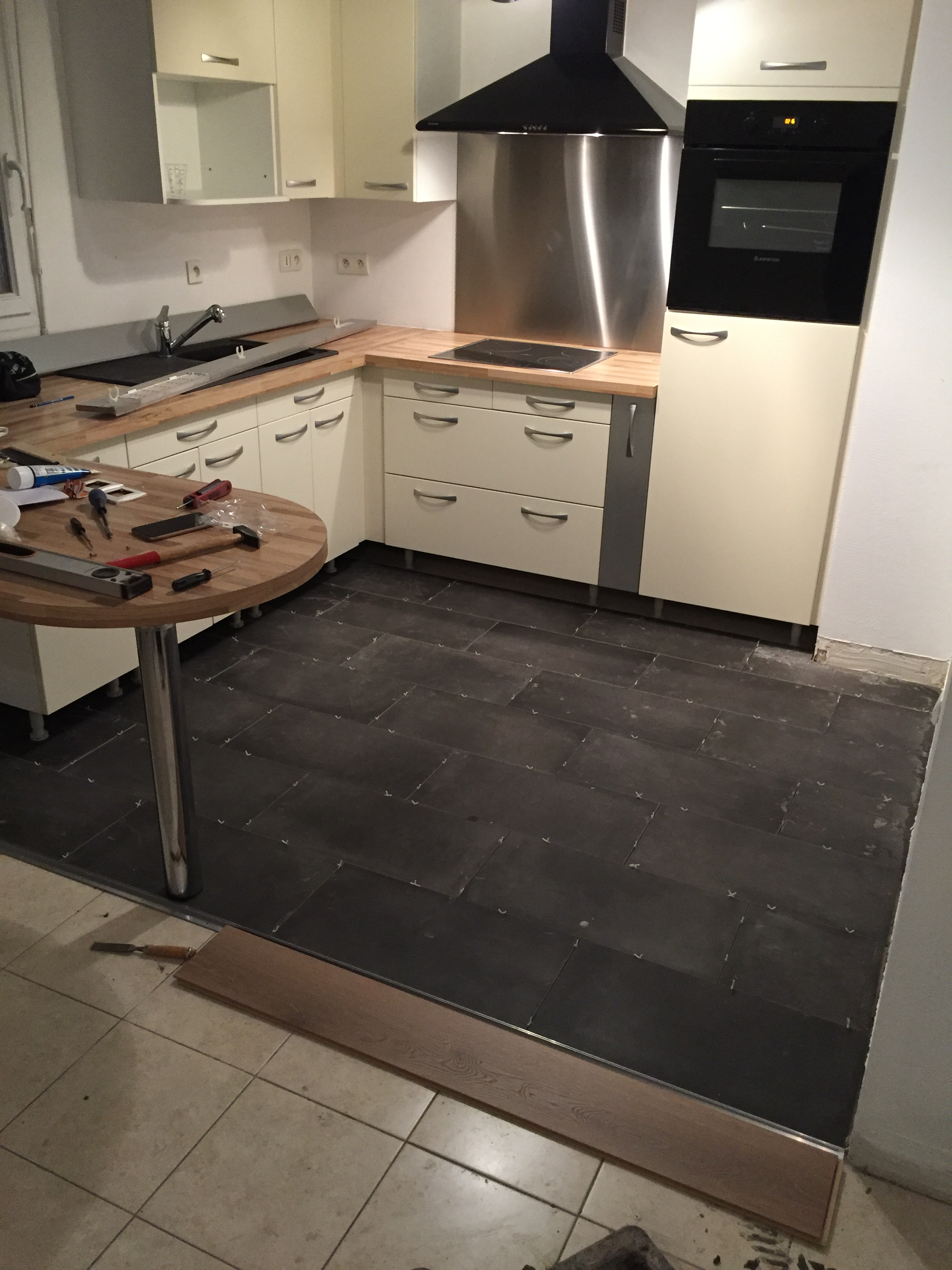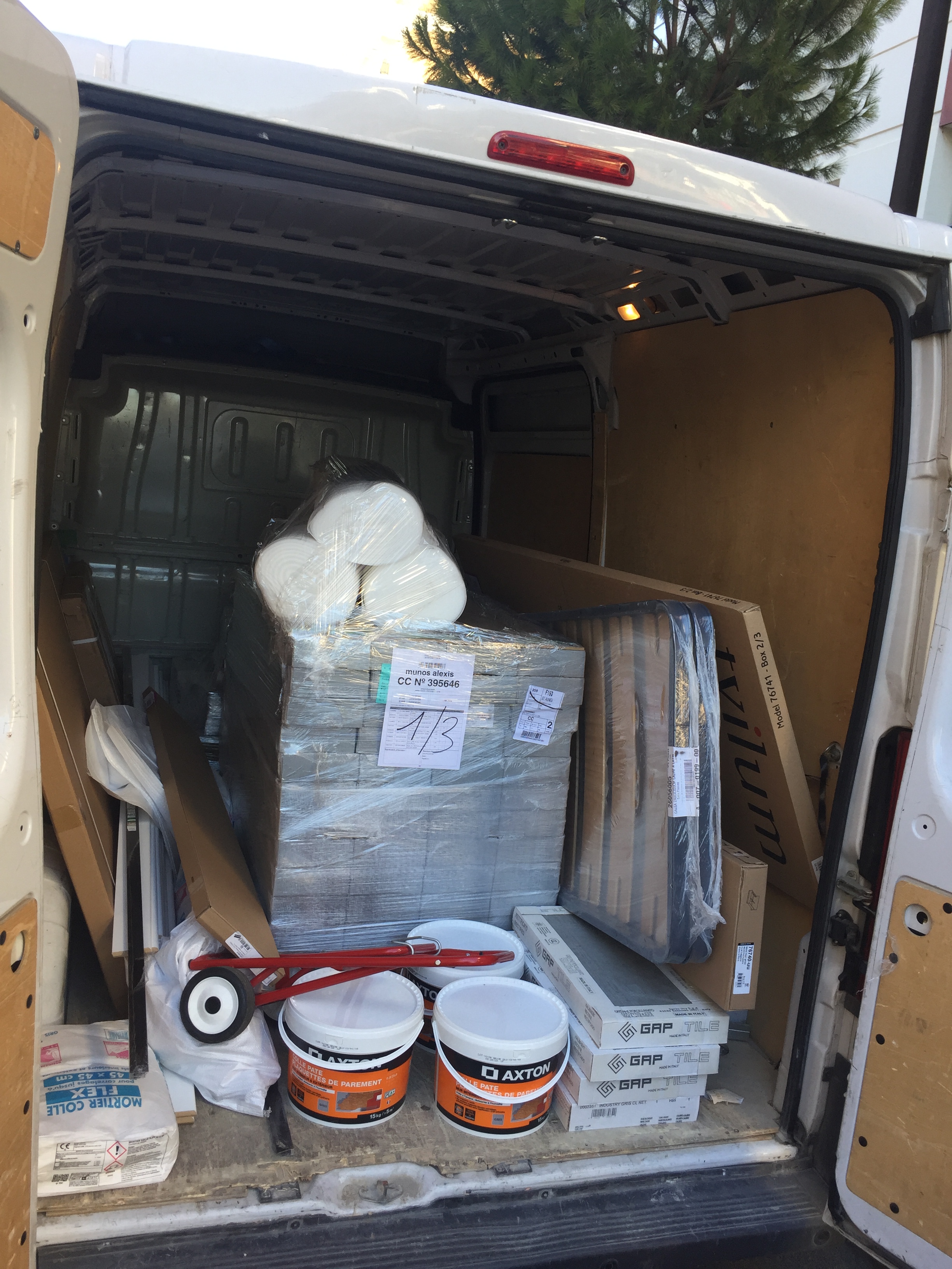C’est bon tout est prêt, après une demi-journée à parcourir le magasin pour choisir les matériaux, nous pouvons récupérer le tout. On loue une camionnette et c’est parti ! Avec un peu d’aide tout à fait bienvenue de la famille, nous déchargeons le tout et pouvons commencer les travaux. Pour cela, je pose une semaine de congés pour aider à la rénovation de l’appartement. Nous n’avons que très peu de photos pendant les travaux. Ci-dessous la photo du départ au chargement de la camionnette, ainsi que le début de la pose du carrelage de la cuisine.