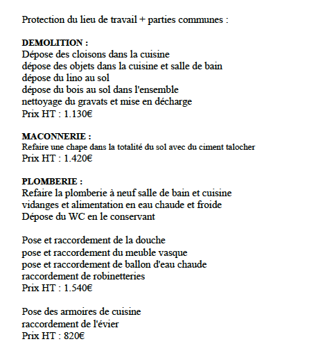 Nous choisissons le même entrepreneur que pour notre premier investissement locatif car nous avons une confiance totale en lui. Notre demande de devis concerne une réfection totale de l’appartement. Vous trouverez le devis ci-dessous ainsi que le détail de tous les travaux réalisés. A noter que nous choisissons de prendre les matériaux nous mêmes afin de les choisir et d’avoir de meilleurs prix.