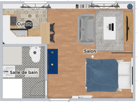 Cuisine : Plusieurs plans de cuisine ont été réalisés avec une difficulté qui était de placer un coin repas. A l’origine, nous avions prévu de mettre une table dans la cuisine. Finalement, la cuisine trop petite et le coffrage à l’endroit de la table à manger nous ont poussé à prendre une autre décision. Le plan 3D ci-dessous a d’ailleurs été modifié en dernière instance. Nous avons finalement agrandi la cuisine en créant une cuisine d’angle et en créant un bar comme coin repas. Pour la peinture, nous avons récupérer les peintures de notre appartement précédent. Un Bleu sur 2 murs afin de délimiter l’espace, carreaux de ciments au sol. Idem pour la cuisine, nous sommes allés au plus simple et plus rapide en prenant les mêmes références que sur notre cuisine précédente ; aménagement meuble de cuisine bas de couleur blanche et meuble haut finition bois. 1 Frigo, 2 plaques à inductions, hotte et ustensiles divers. Rideaux occultants.