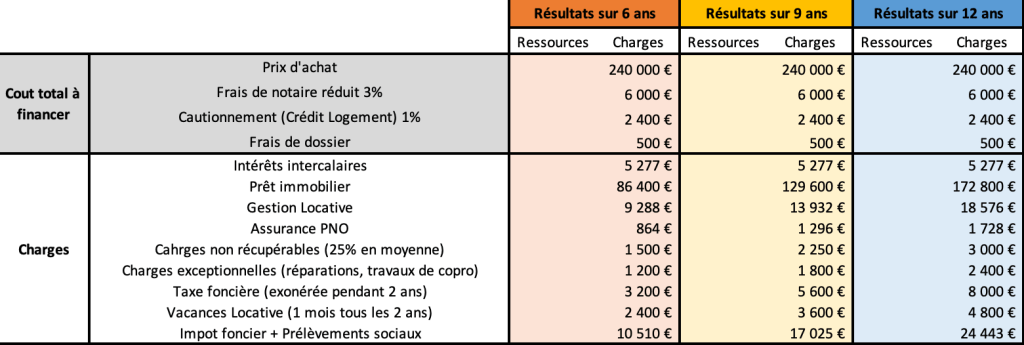 Alors on pourrait se dire que dans le cadre de l’hypothèse 3 et une revente au prix d’achat, soit +60% par rapport au prix moyen de l’ancien, le résultat net est positif. Effectivement, après avoir fait un effort d’épargne de 500€ par mois, notre investisseur peut espérer avoir un gain de 26000€ après 6 ans, 46000€ après 9 ans et 58500€ après 12 ans.