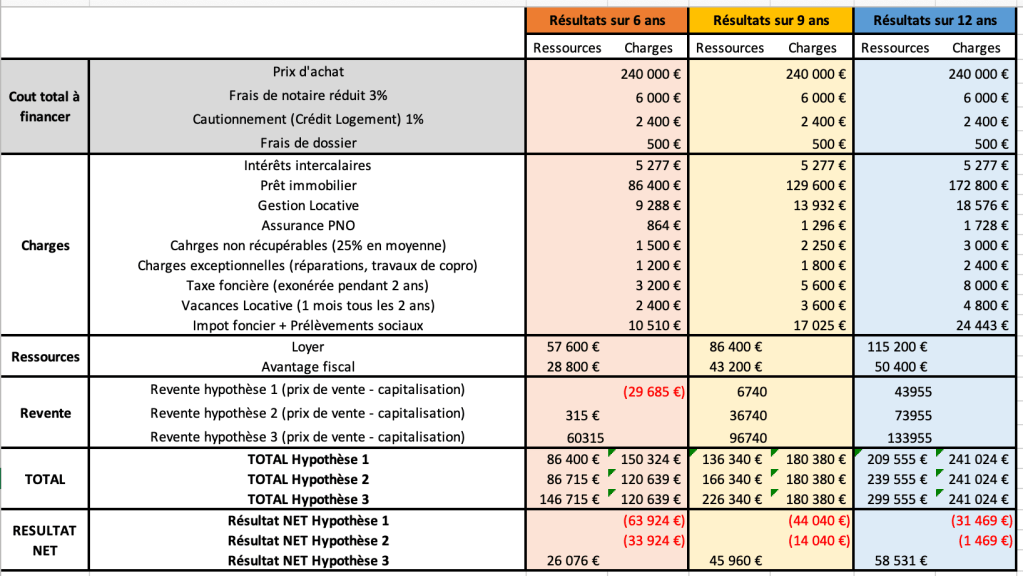 En tenant compte de l’ensemble des charges et des ressources, la balance pour l’investisseur est donc de :