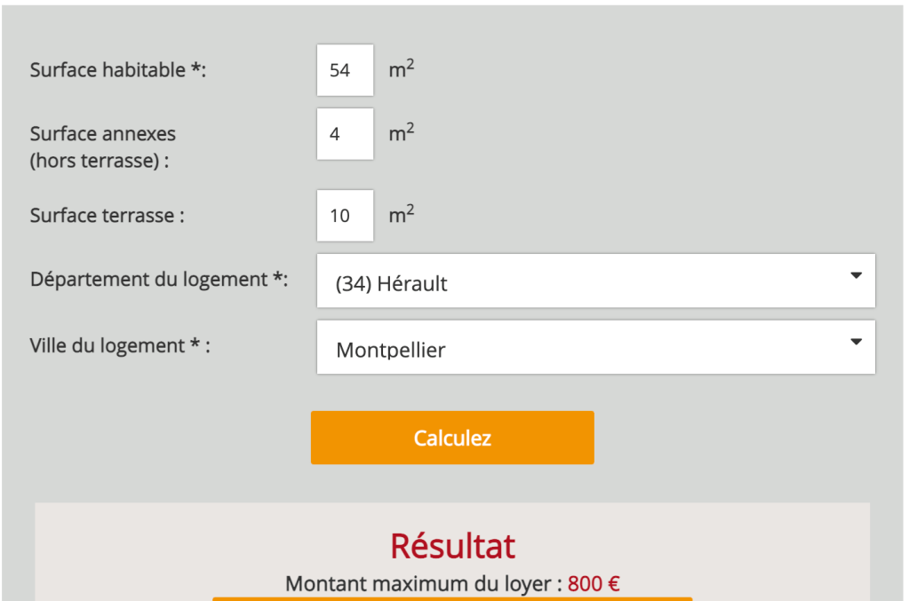 Afin de déterminer le montant du loyer maximum, nous avons utilisé le simulateur en ligne qui tient compte de la zone d’éligibilité et des caractéristiques du bien pour fixer un montant de loyer maximum par mois. Pour un logement de 54m2 à Montpellier, avec une cave de 4m2 et une terrasse de 10m2, le loyer maximum autorisé en PINEL est de 800€/mois.