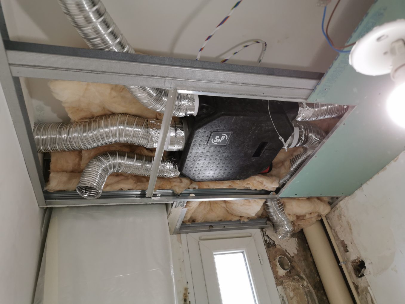 Les appels pour le ravalement se font en Février et en Mai et la réalisation des travaux pour la remise en état ne se fera qu’en Mai, car nous devons attendre que les murs sèchent complètement avant de refaire les peintures. Ci-dessous quelques photos pendant les travaux de remise en état, ainsi que la référence utilisée pour la VMC. Nous avons positionné les bouches d’aspiration d’air dans l’entrée, la cuisine, et 2 dans la salle d’eau. Une entrée d’air a également été créée, un doublage du mur côté fenêtre et nous avons changé tout le carrelage sur le mur par un nouveau que nous avons placé sur 3 murs (incluant le mur côté fenêtre).