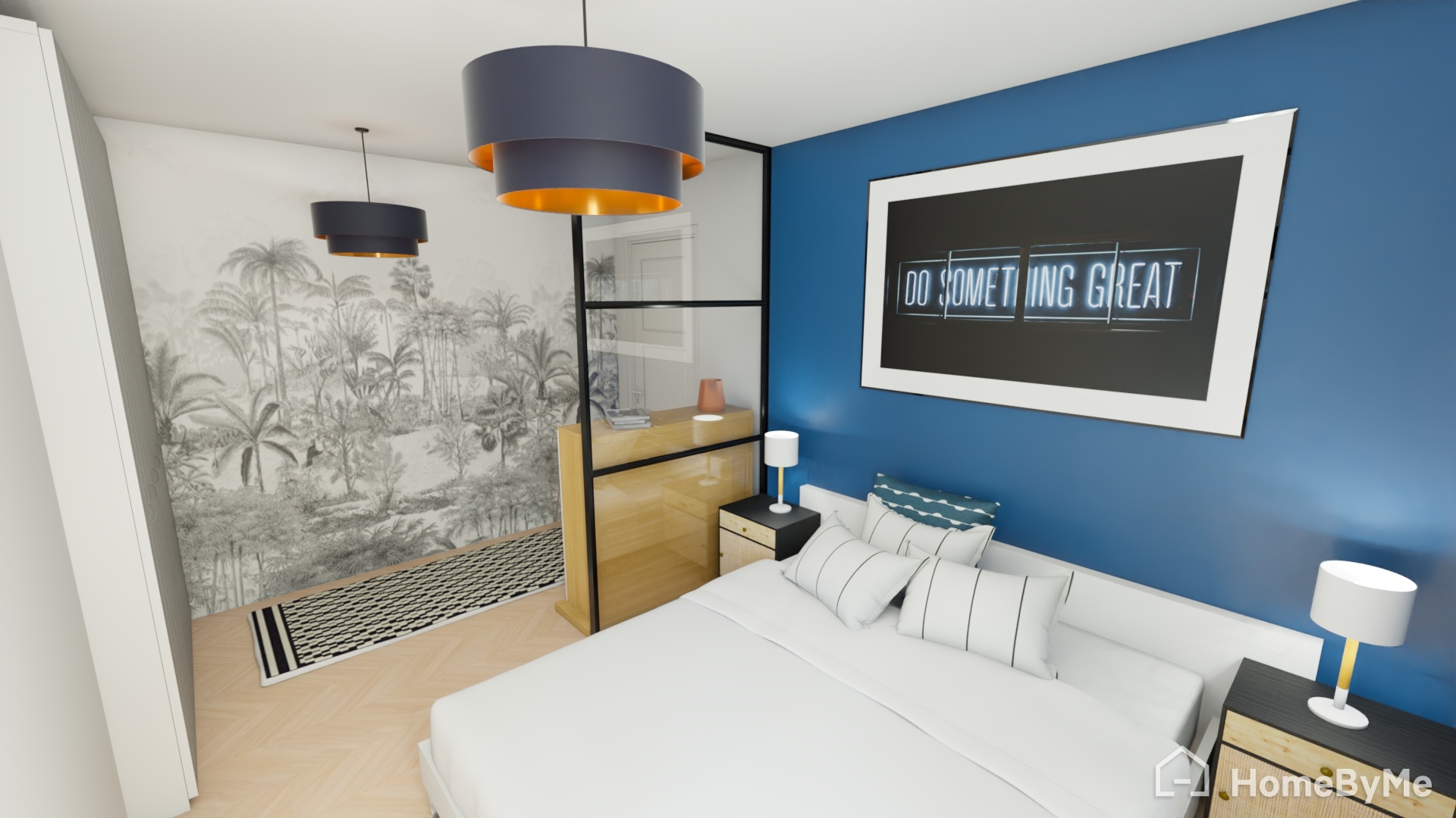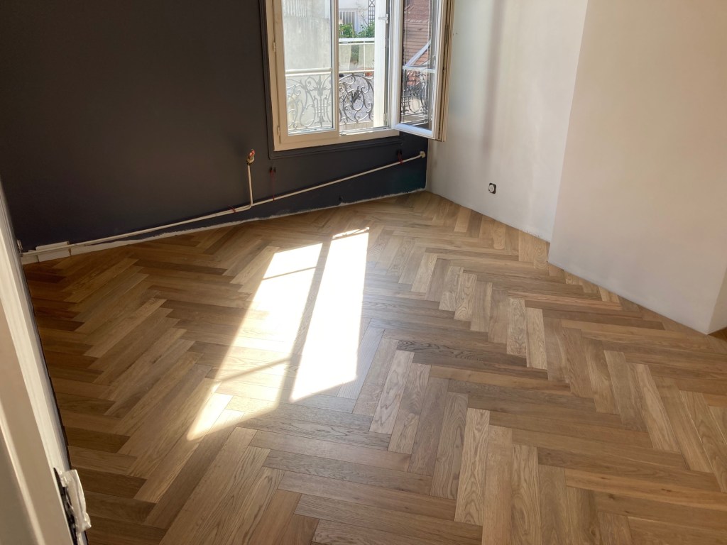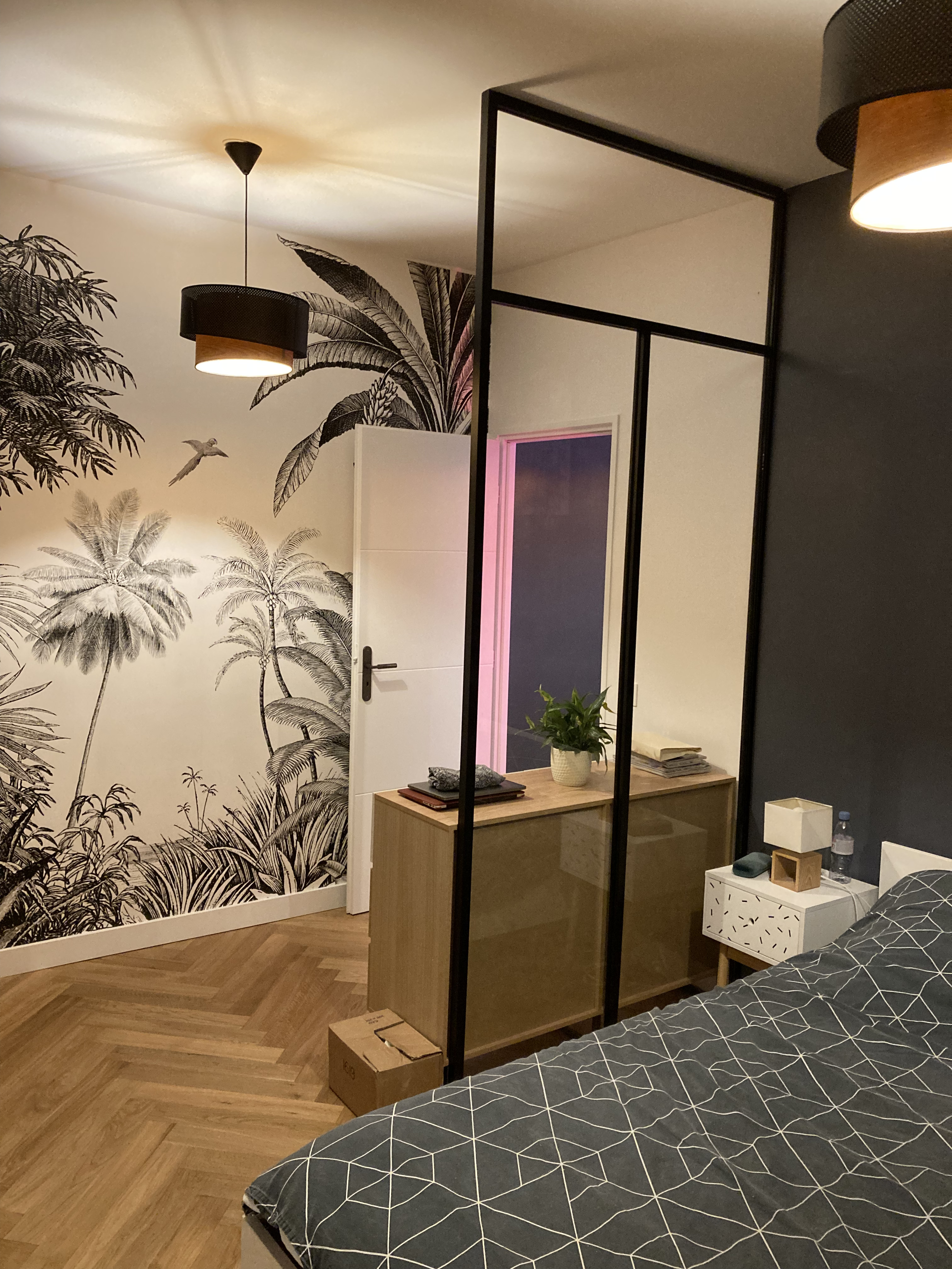 Chambre 2 : Ragréage du sol et pose du parquet bâton rompu dans la chambre. Côté peinture, nous choisissons une couleur bleue pour délimiter le coin nuit. Tous les autres murs en blanc. Nous ajoutons une verriere sur mesure pour accentuer la délimitation entre le coin nuit et le coin dressing.