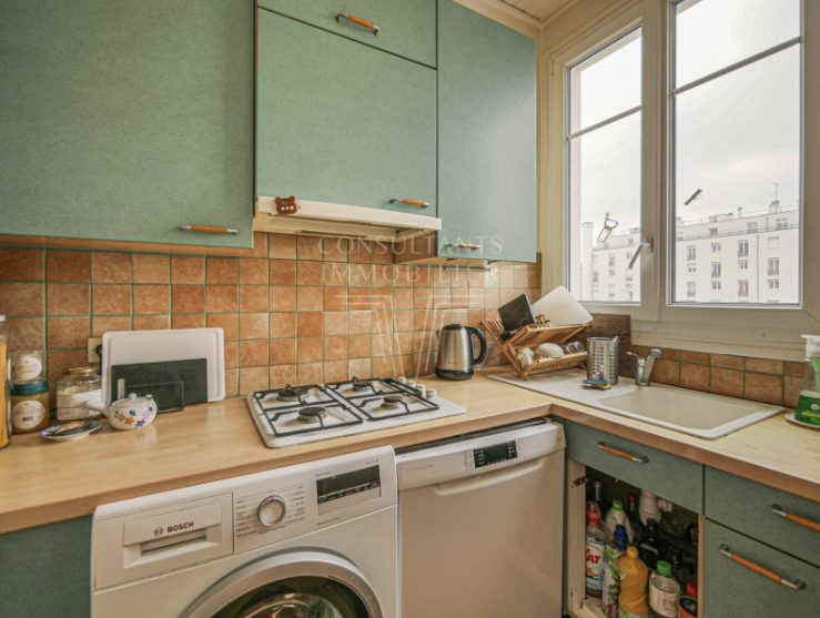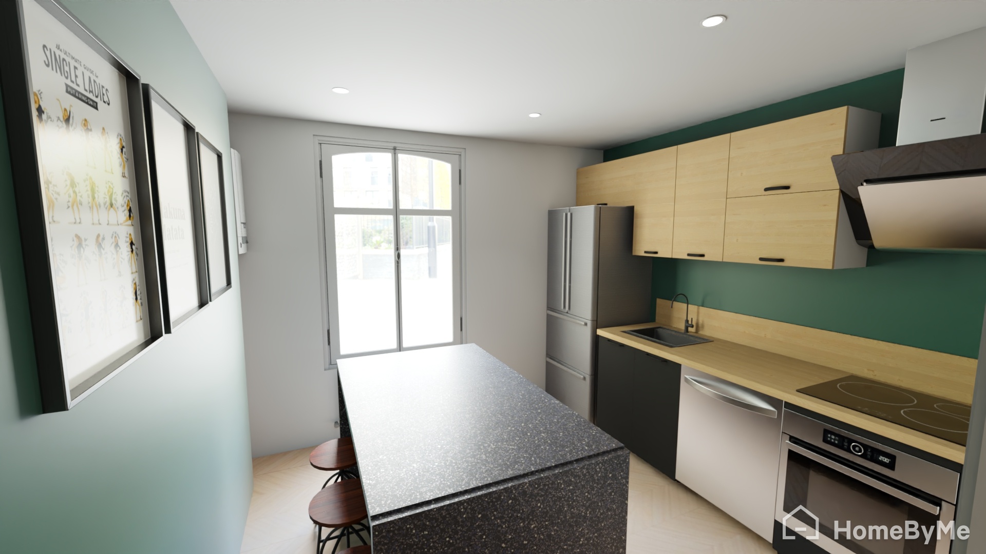 Cuisine : Plusieurs plans de cuisine ont été réalisés avec une difficulté qui était d’avoir suffisamment de plan de travail pour cuisiner ainsi qu’un espace large pour accueillir un nouveau frigo plus large. À l’origine, nous avions prévu de faire une cuisine en angle. Finalement, la cuisine semblait trop petite et il n’y avait pas assez de plans de travail pour cuisiner. Le plan a d’ailleurs été modifié en dernière instance, pour adopter une cuisine avec ilot central. Pour la cuisine, nous avons pris du Leroy Merlin (4ème cuisine avec eux) qui rend très bien, et pour l’ilot central nous avons opté pour un spécialiste (Easy Plan) qui nous a posé un granit NOIR ZIMBABWE EXTRA. Pour la peinture, nous avons choisi un Vert Amazone de chez Castorama. Création d’un faux plafond pour aspiration de la VMC. Création d’une ouverture en façade pour l’extraction de la VMC (accord obtenu en AG). Pose d’une nouvelle chaudière ELM LEBLANC et désembouage du réseau de radiateurs.