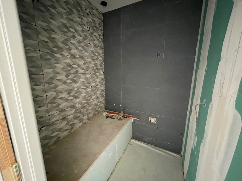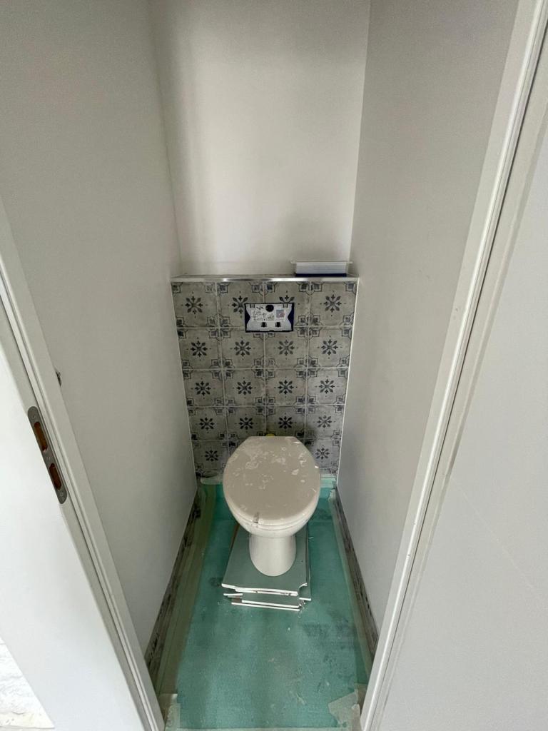 WC : Dépose de l’ancien WC, création d’un faux plafond pour accueillir une gaine de la VMC. Pose d’un WC suspendu avec bâti support Geberit. Pose d’un carrelage Leroy Merlin (idem buanderie).