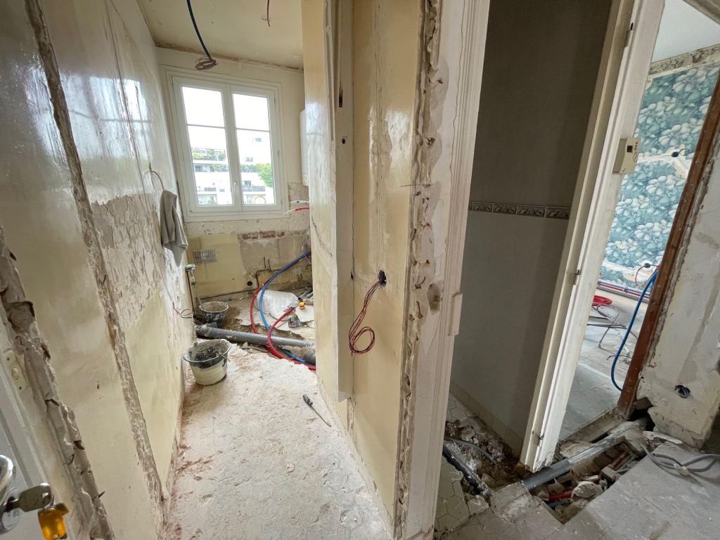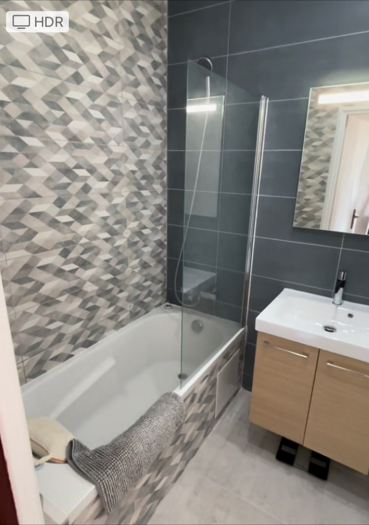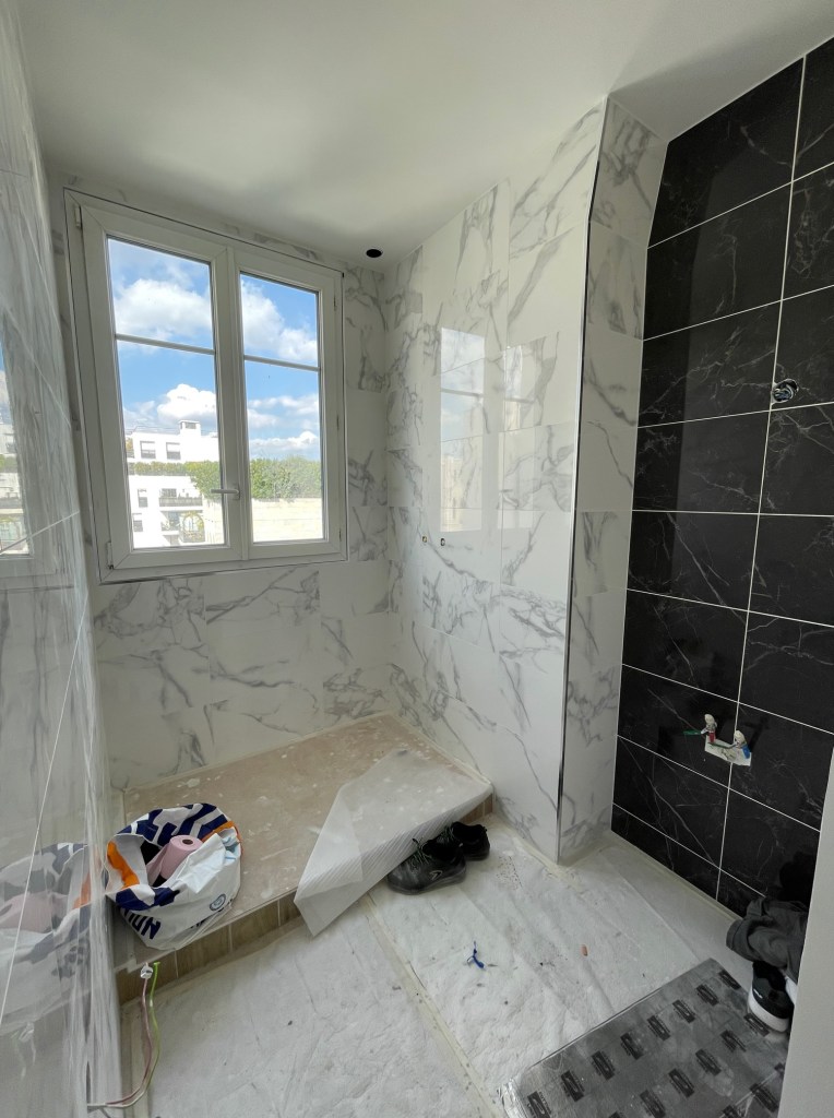 Salle de bain : Destruction de la salle de bain et création de la salle de bain principale à la place de l’ancienne cuisine, avec création d’une nouvelle ouverture dans l’entrée, et cloisonnement de l’ancienne ouverture côté (future) cuisine. Destruction du sol (voir photos) et reprise de la plomberie générale passant sous l’appartement. Tous les matériaux ont été achetés à Leroy Merlin (Carrelage sol imitation parquet, carrelage mur, plinthes, meuble vasque, bac à douche, robinetterie). Création d’un faux plafond pour accueillir une gaine de la VMC.