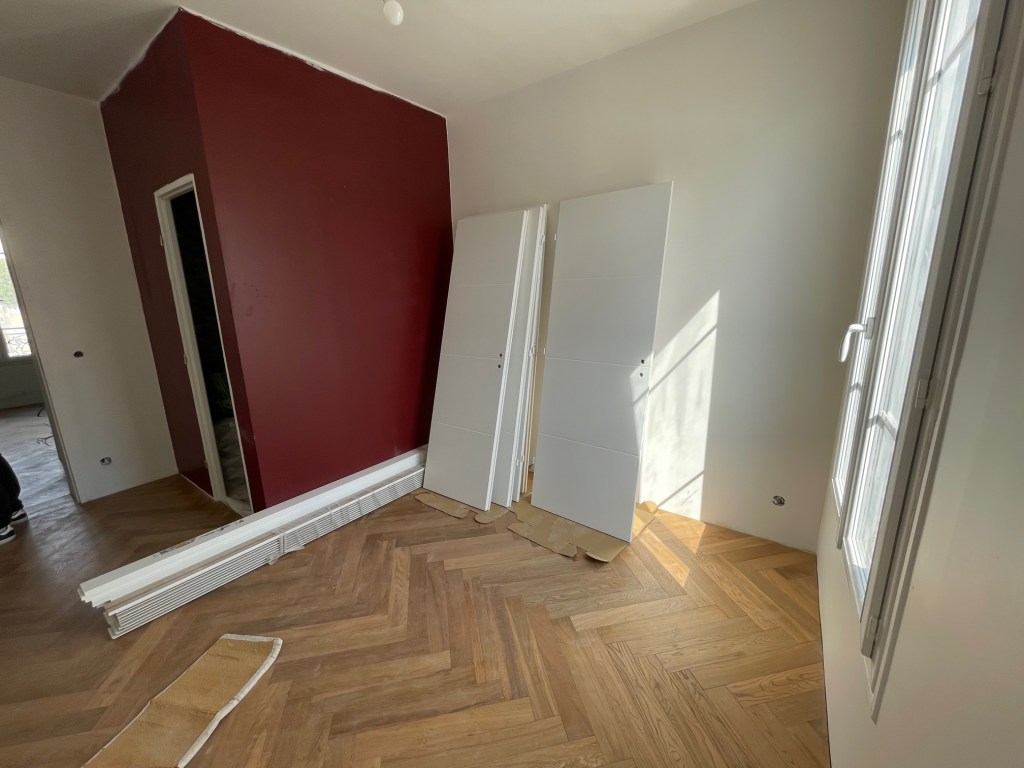 Chambre 1 : Création d’une 2ème salle de bain (destruction du sol, pose d’un nouveau sol et ragréage, cloisonnement, carrelage sol et murs Leroy Merlin). Ragréage du sol et pose du parquet bâton rompu dans la chambre. Côté peinture, nous choisissons une couleur Terracota pour les murs extérieur de la salle de bain, le reste des murs en blanc.