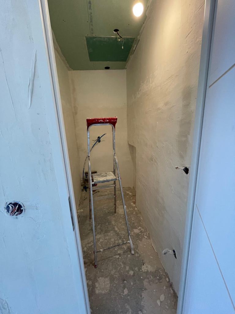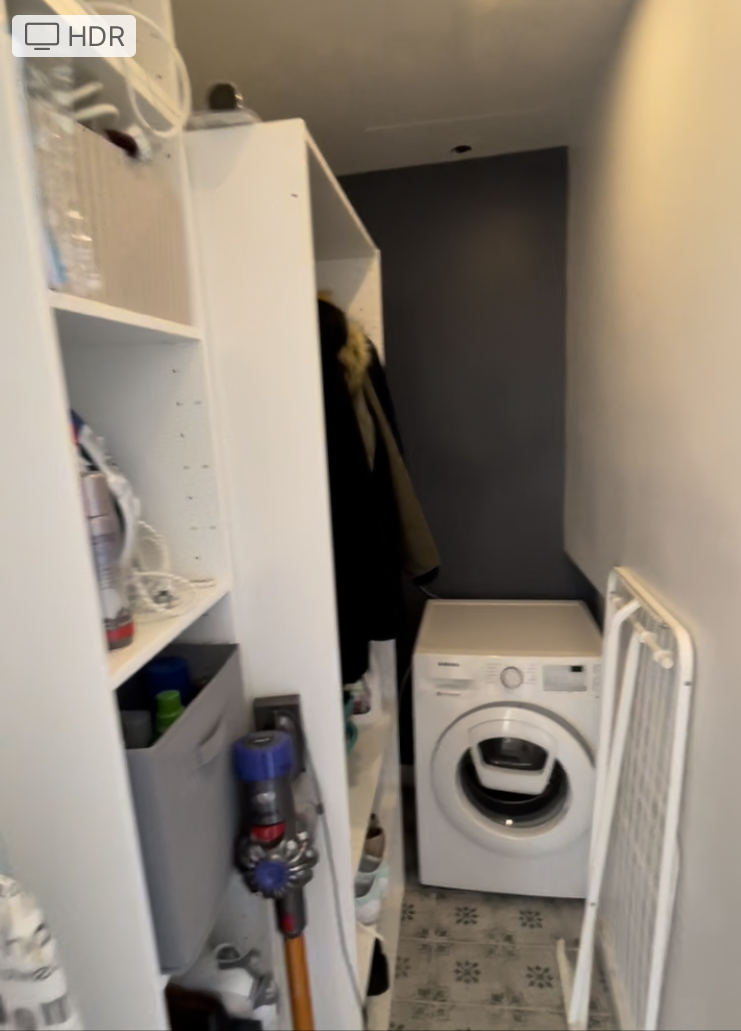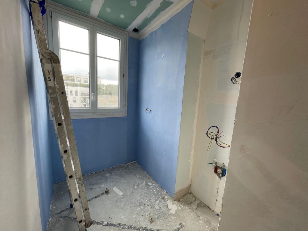 Buanderie : Création d’un coin buanderie à la place de la salle de bain d’origine. Installation d’un faux plafond pour accueillir une VMC simple flux hygro, qui aspire dans toutes les pièces d’eaux (cuisine, 2 salles de bain, WC et buanderie). Ragréage du sol et pose d’un carrelage Leroy Merlin. Côté plomberie, reprise des arrivées d’eau pour accueil d’une machine à laver et installation d’un panneau de commande pour la robinetterie de tout l’appartement.