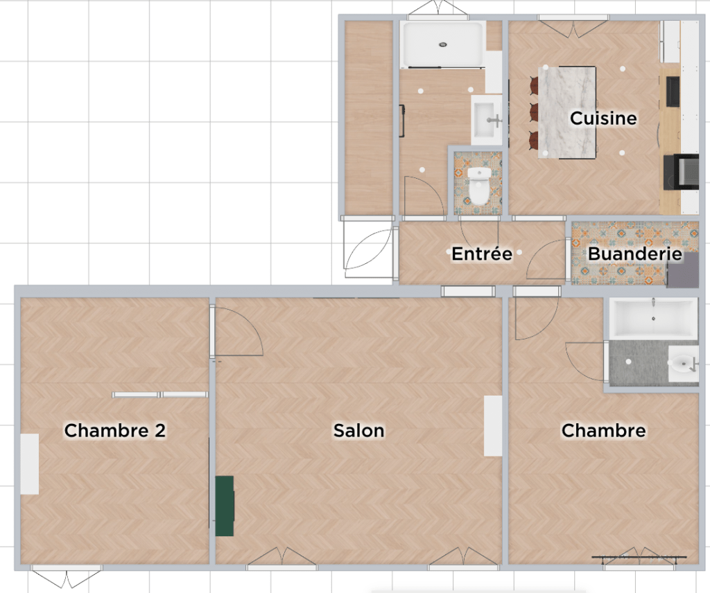 Au même titre que pour les appartements précédents, nous entamons la première étape d’avant travaux par la réalisation d’un plan de projection 2D. Là encore nous utilisons le logiciel Home By Me pour réfléchir à toutes les combinaisons d’aménagement possibles. Une fois les cotes de l’appartement renseignées nous identifions la nécessité de redéfinir l’espace. Nous envisageons alors de supprimer la cloison de la cuisine afin d’en réduire l’espace et de créer un espace ouvert. Ci-dessous le plan original ainsi que la projection 2D.