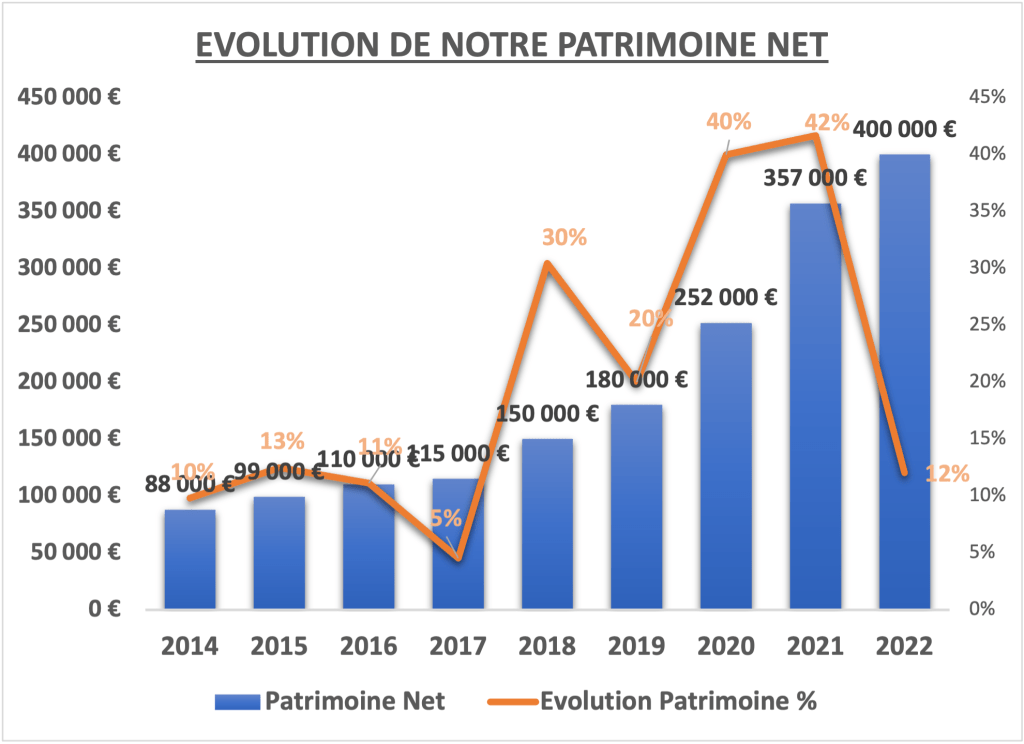 Notre patrimoine net à date est constitué de 400 000€ dont voici ci-dessous l’évolution des dernières années :